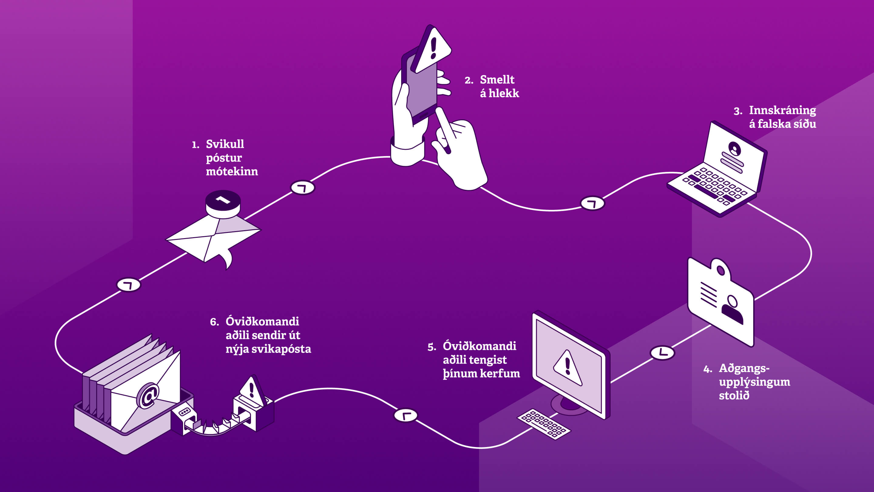 6.      Ógnaraðilinn tengir sig inn í þín kerfi með þínum aðgangslyklum og getur þar valdið ómældum skaða. Algengt er að hann sendi fleiri svikapósta með svikult viðhengi eða hlekk á þúsundir nýrra fórnarlamba í þínu nafni.